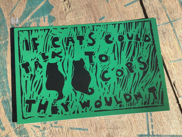 These "If Cats Could Talk to Cops They Wouldn't" stickers, featuring original artwork by Teev, are so popular we just keep reprinting them. They measure 4.25" wide by 2.75" tall and are available in different color options.