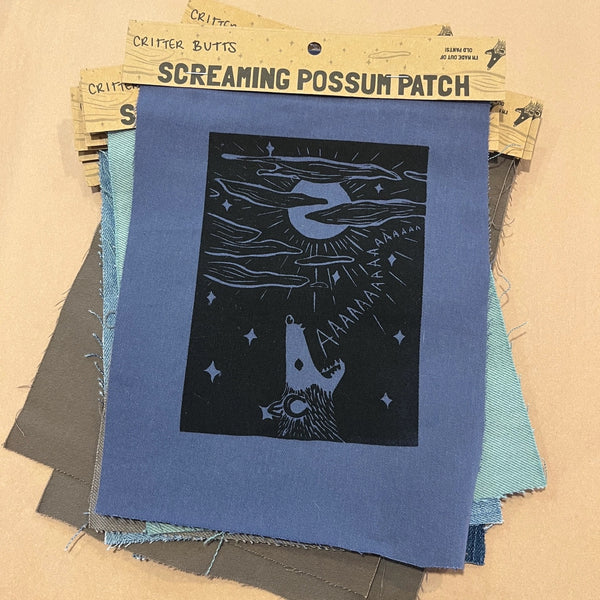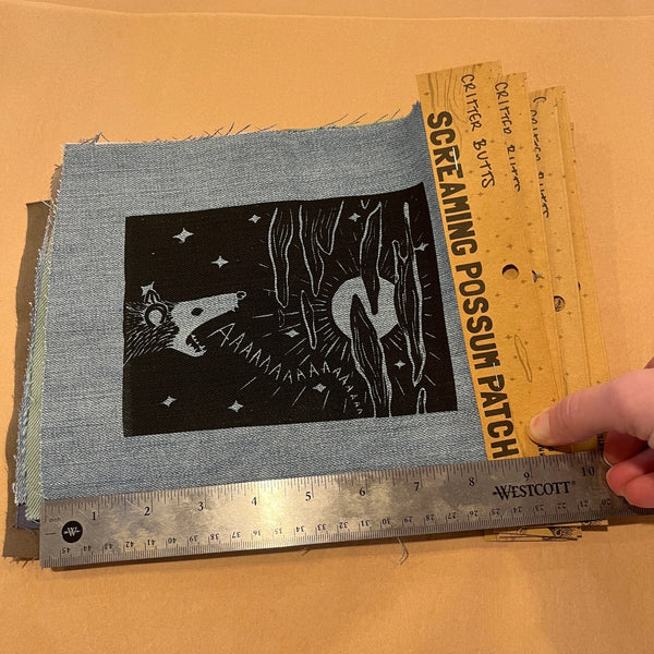 These patches (based on a Critter Butts original linocut) are screen printed by Joan & Dylan in their home studio with water based ink on thrifted 97%+ cotton denim/pants material. Fabric content will vary from 97-100% cotton, with occasionally 1-3% being elastane/spandex/etc. Some patches will be thicker weave denim, while others may be finer weave, as in khaki pants.